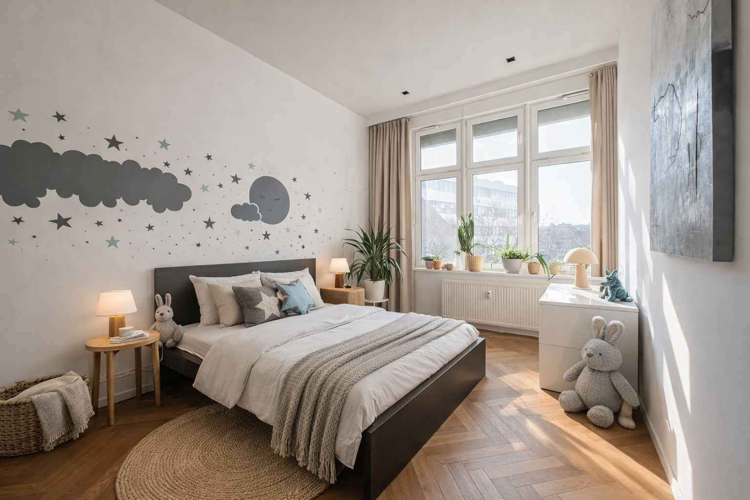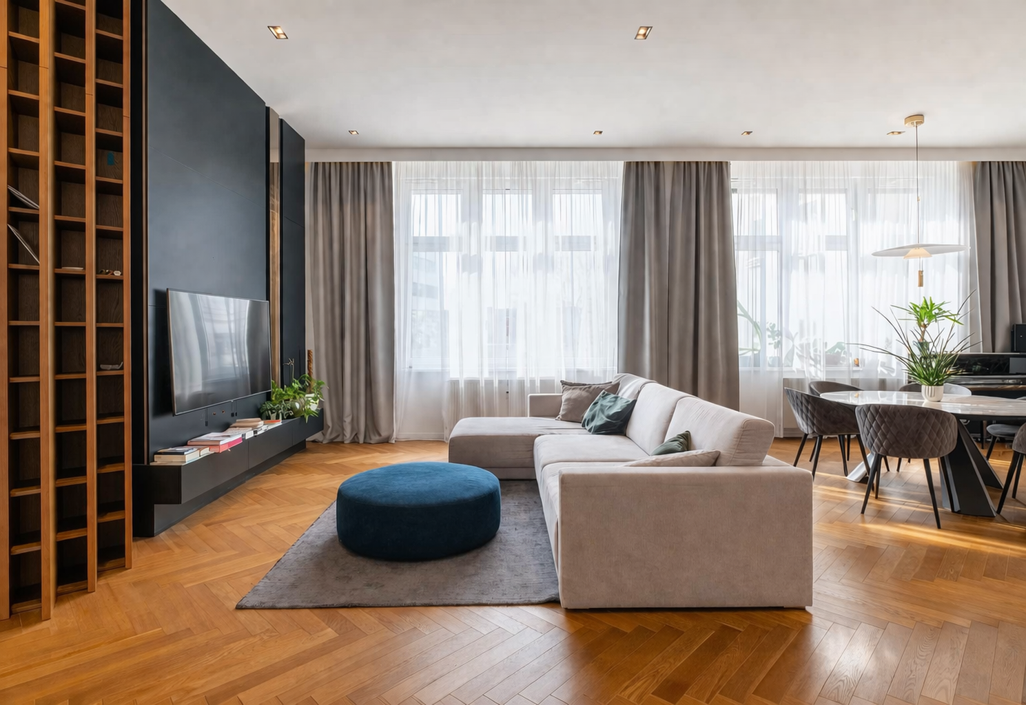 Byt zaujme najmä veľkorysou výmerou, vysokými stropmi (3,4 m) a funkčne riešenou dispozíciou, ktorá prirodzene oddeľuje dennú a nočnú časť.