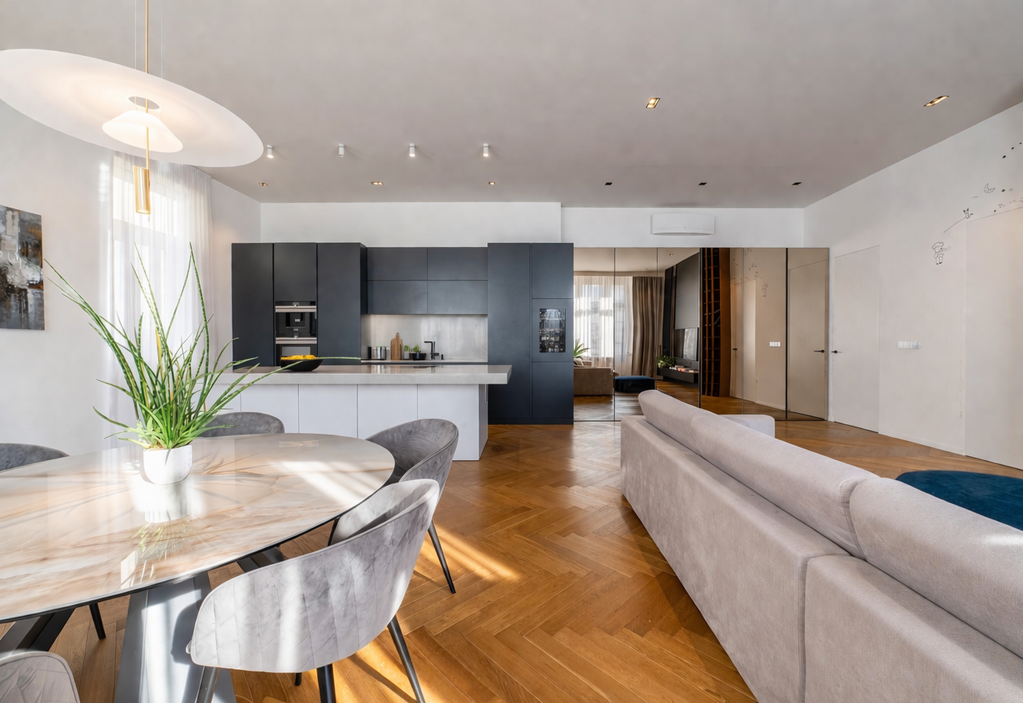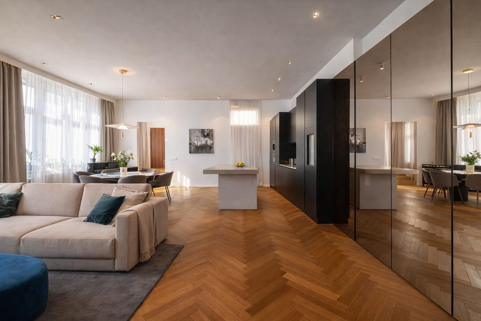 Dominantou bytu je mimoriadne priestranná obývacia izba s kuchynským kútom, doplnená o praktickú komoru a kúpeľňu so sprchovacím kútom a WC, prístupnú cez skryté dvere. Chodba ďalej vedie do dvoch samostatných izieb, práčovne a druhej kúpeľne s vaňou.