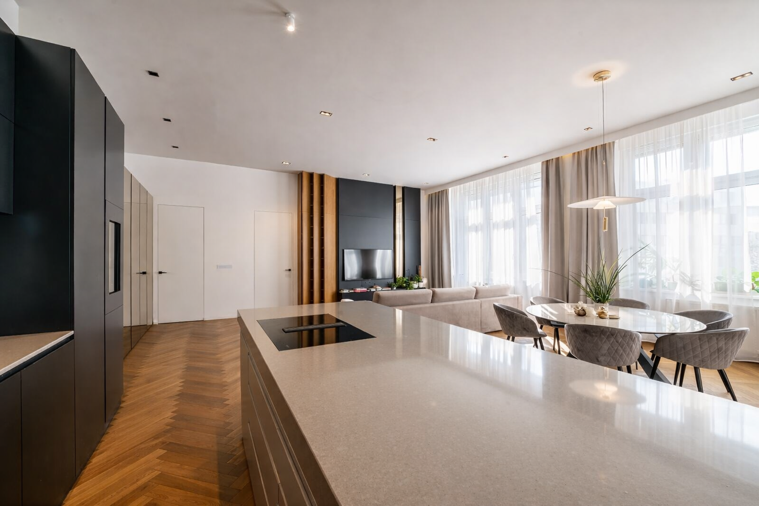 Byt je vyhotovený vo vyššom štandarde s dôrazom na kvalitu materiálov a dlhodobú funkčnosť. Vysoké stropy a veľké okenné plochy zabezpečujú dostatok denného svetla a umocňujú pocit priestoru.