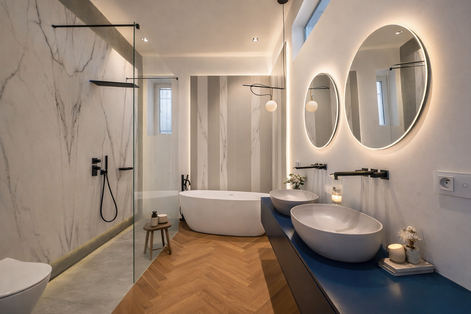 - veľkoplošné drevené parkety a keramická dlažba